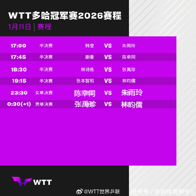 另外,代表中国澳门出战的前宇宙第一朱雨玲、代表德国出战的削球手韩莹也打进四强。其中,陈幸同以4-3慑服张本好意思和晋级四强,韩莹以4-3险胜一号种子王曼昱晋级四强。