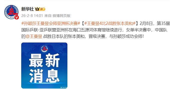 2月8日,第35届海外乒联-亚乒定约亚洲杯在海口五源河体育馆不息进行,女单半决赛中,中国队的王曼昱驯服日本队的张本好意思和,晋级决赛,与孙颖莎告捷会师!