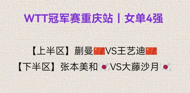 上半区两场1/4决赛中,王艺迪4-3险胜韩国一姐申裕斌,蒯曼4-2校服寰球一姐孙颖莎,大迪和大丫头会师上半区半决赛。