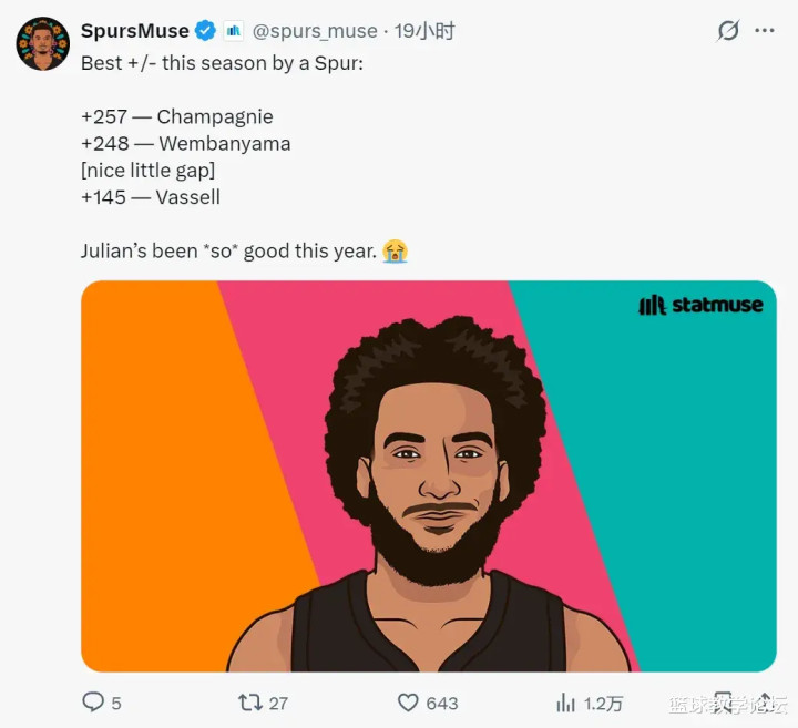 马刺媒体SpursMuse晒出一组数据:尚帕尼+257高居队内第一;文班亚马+248排行第二;瓦塞尔+145,马刺队内第三。尚帕尼本赛季场均正负值+5.7,定约第17,相同是马刺队内第一;瓦塞尔+4.5体育录像/图片,定约第26,队内第二。