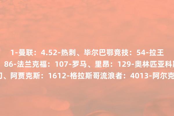 1-曼联:4.52-热刺、毕尔巴鄂竞技:54-拉王人奥:65-皇家社会:86-法兰克福:107-罗马、里昂:129-奥林匹亚科斯:1410-费内巴切、阿贾克斯:1612-格拉斯哥流浪者:4013-阿尔克马尔:5014-布加勒斯特星:8015-博德精明:10016-比尔森顺利:200【欧联1/8决赛对阵】上半区阿尔克马尔vs热刺阿贾克斯vs法兰克福博德精明vs奥林匹亚科斯比尔森顺利vs拉王人奥下半区