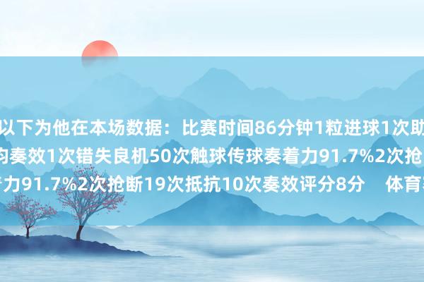 以下为他在本场数据:比赛时间86分钟1粒进球1次助攻3射2正6次过东谈主均奏效1次错失良机50次触球传球奏着力91.7%2次抢断19次抵抗10次奏效评分8分 体育赛事直播