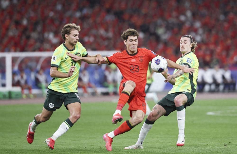 2025年3月25日,中国队球员拜合拉木(中)在比赛中拼抢。新华社记者 张晨 摄